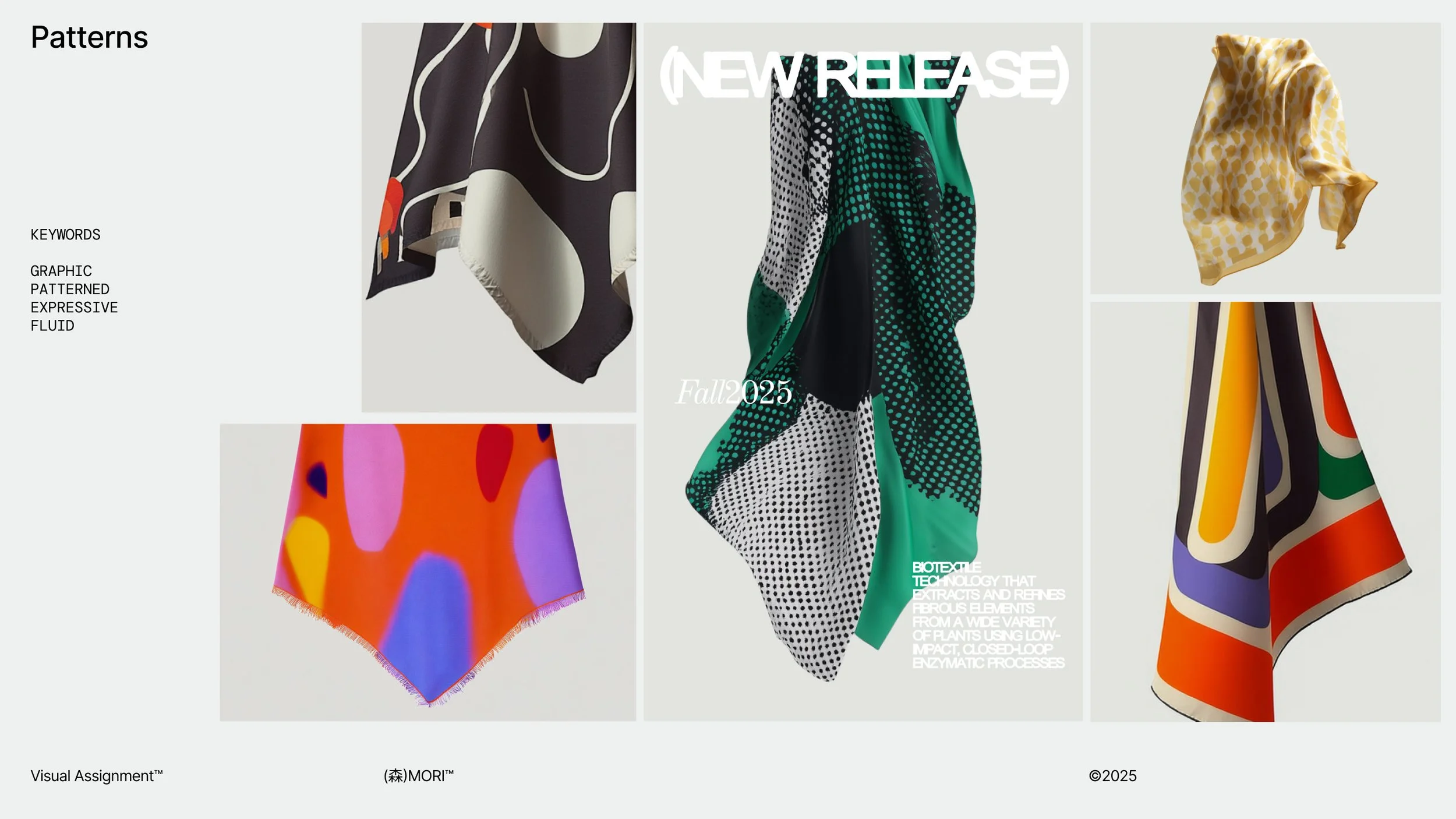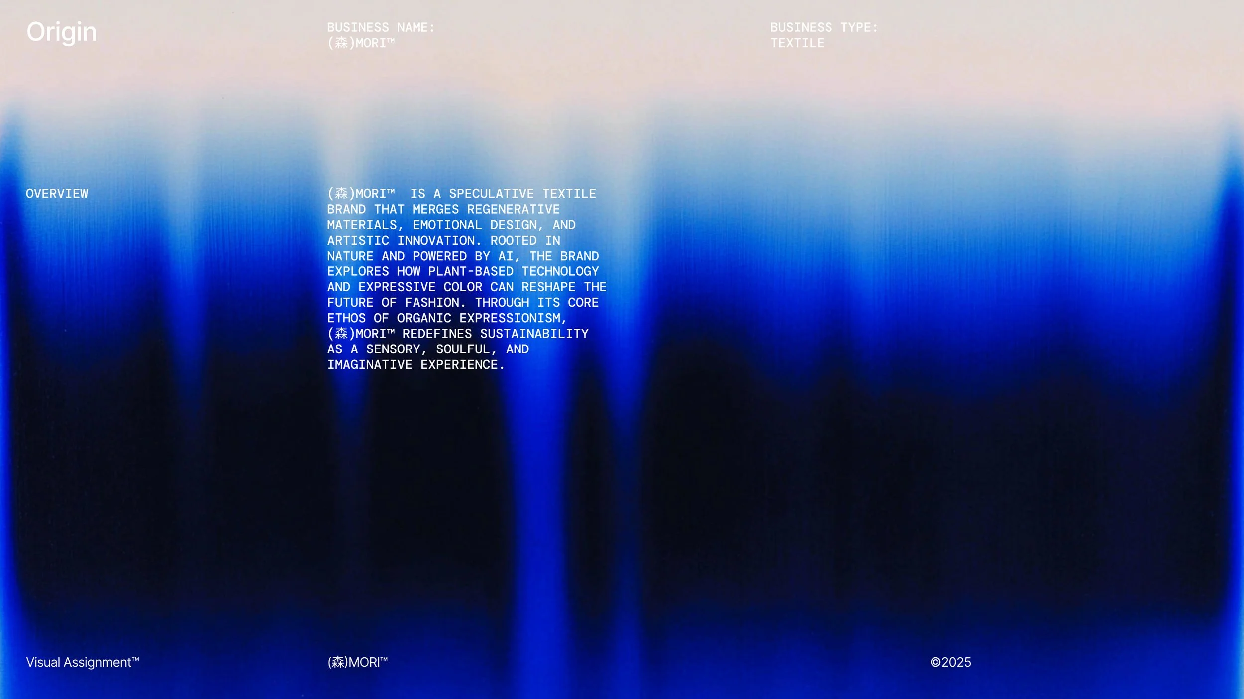 The outcome is a fully realized speculative brand that redefines how AI-enabled textiles can be expressed—bridging earth-conscious chemistry, storytelling, and cultural aesthetics. From technology naming to visual language, (森)MORI™ establishes a new paradigm where materials are both functional and emotionally resonant. The result is a brand world that feels premium, poetic, and primed for meaningful collaboration across industries.